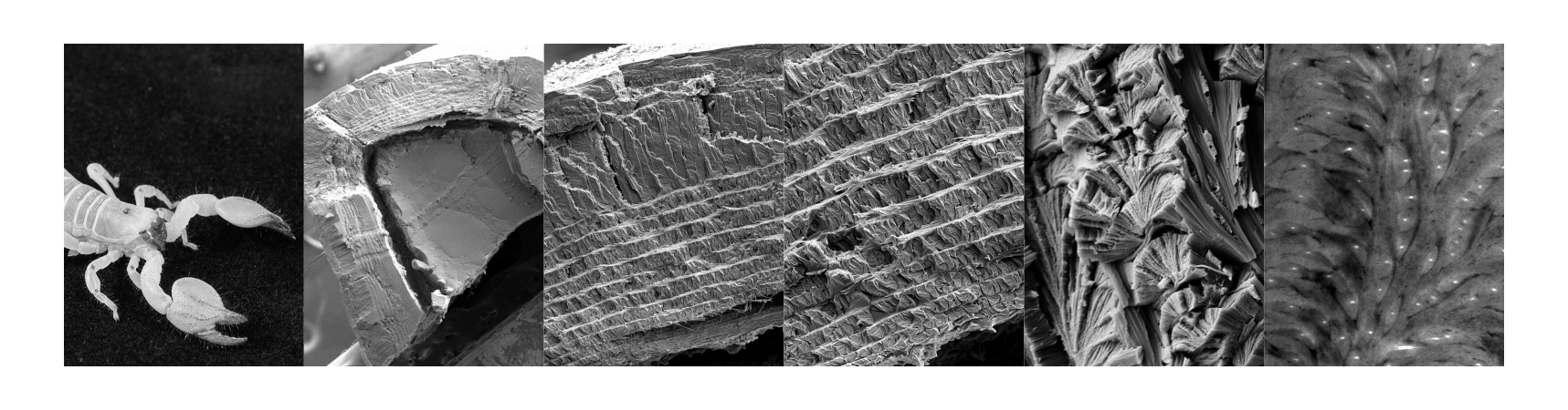 We study the hierarchical organization and chemical composition of arthropod exoskeletons to uncover the design rules that govern their robust mechanical performance. Our focus lies in connecting multiscale architecture, interfacial chemistry, and material gradients to toughness, strength, and damage tolerance across environmental conditions.